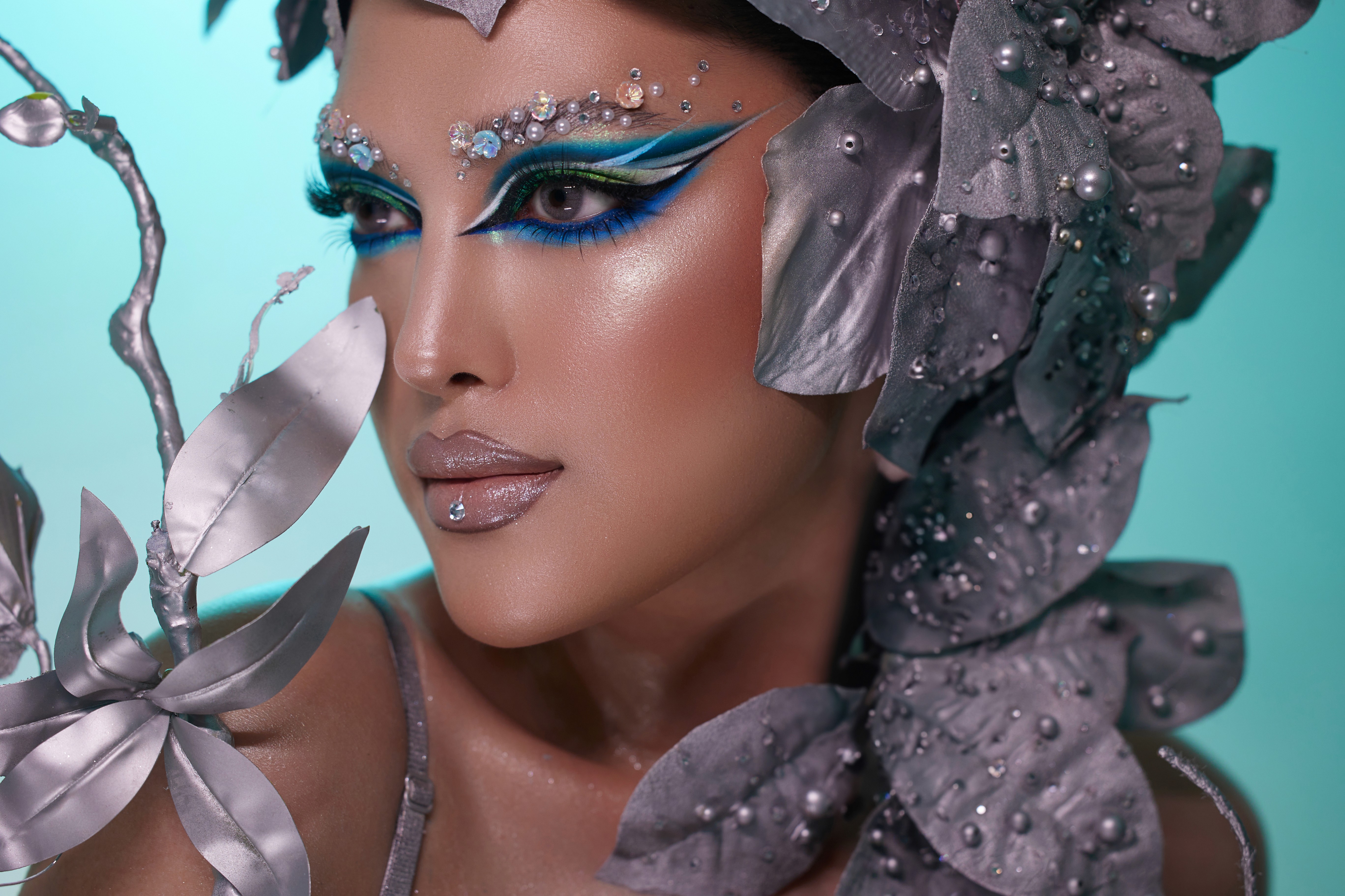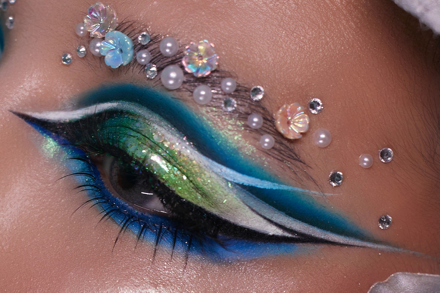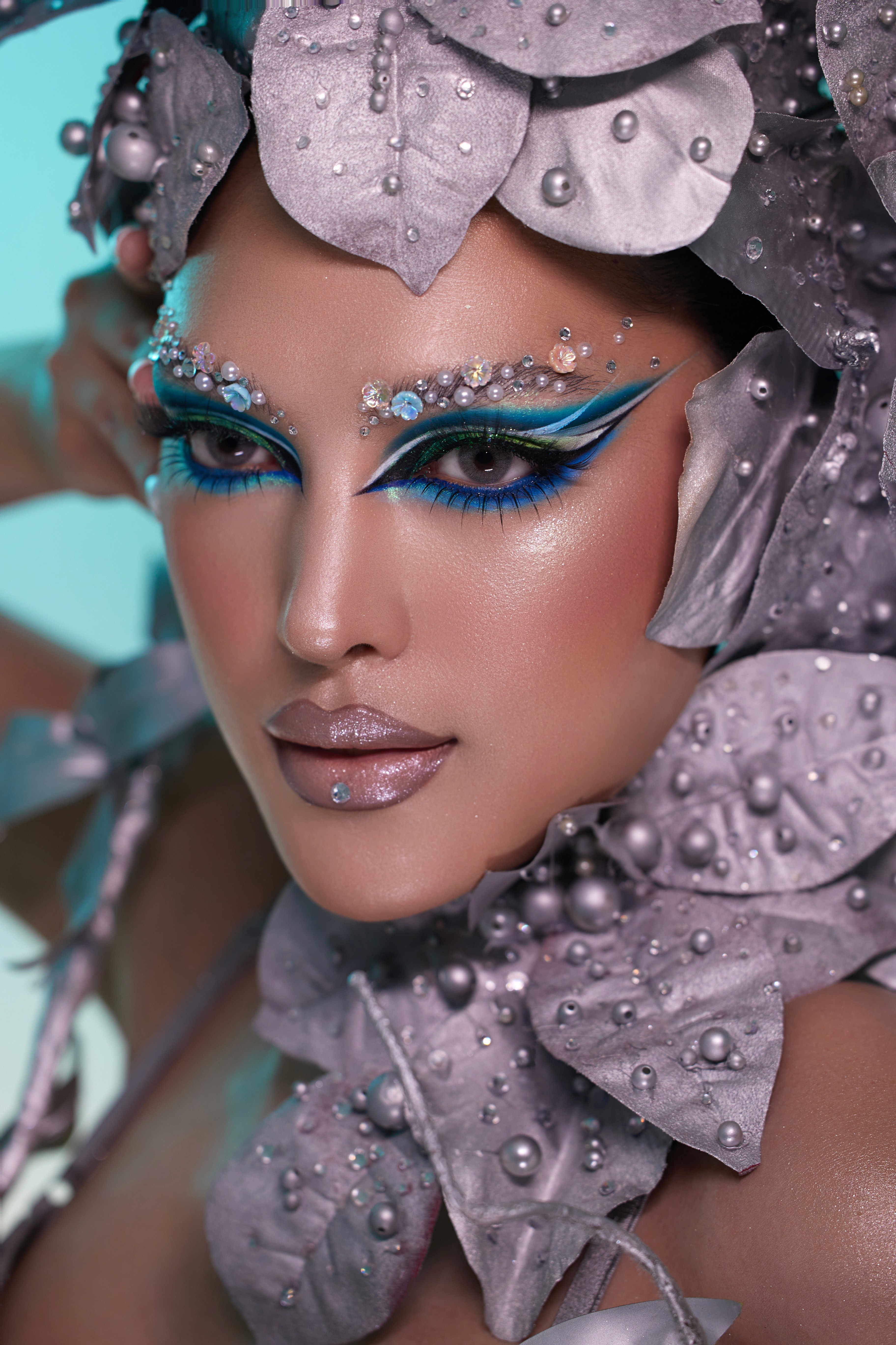 For this concept, I designed an avant-garde makeup look that pushes beyond traditional beauty. Using vibrant blues, greens, and shimmering textures, the eye design becomes the central focus of the composition. The addition of crystal embellishments and detailed liner work creates a dramatic yet elegant visual impact.