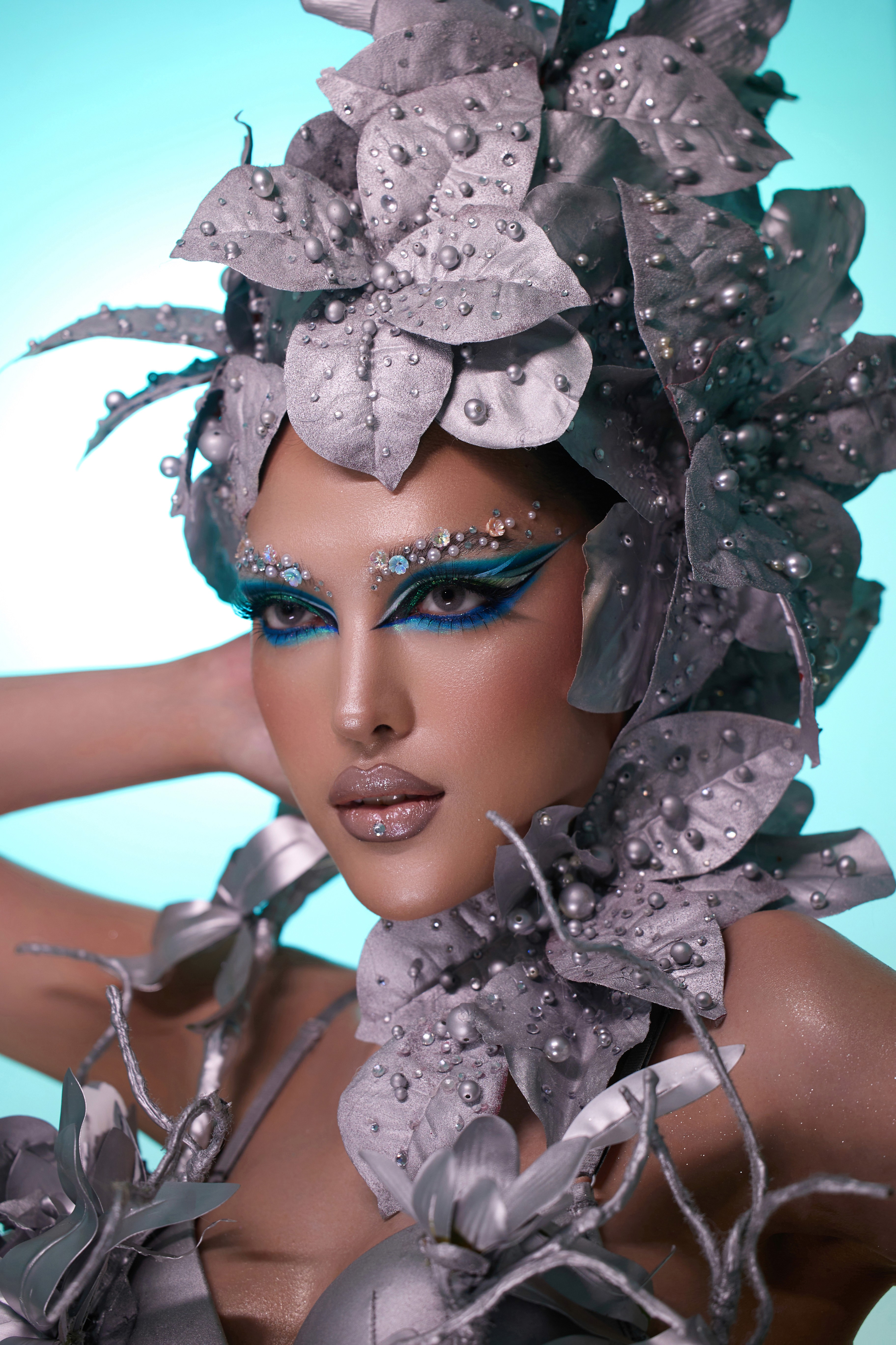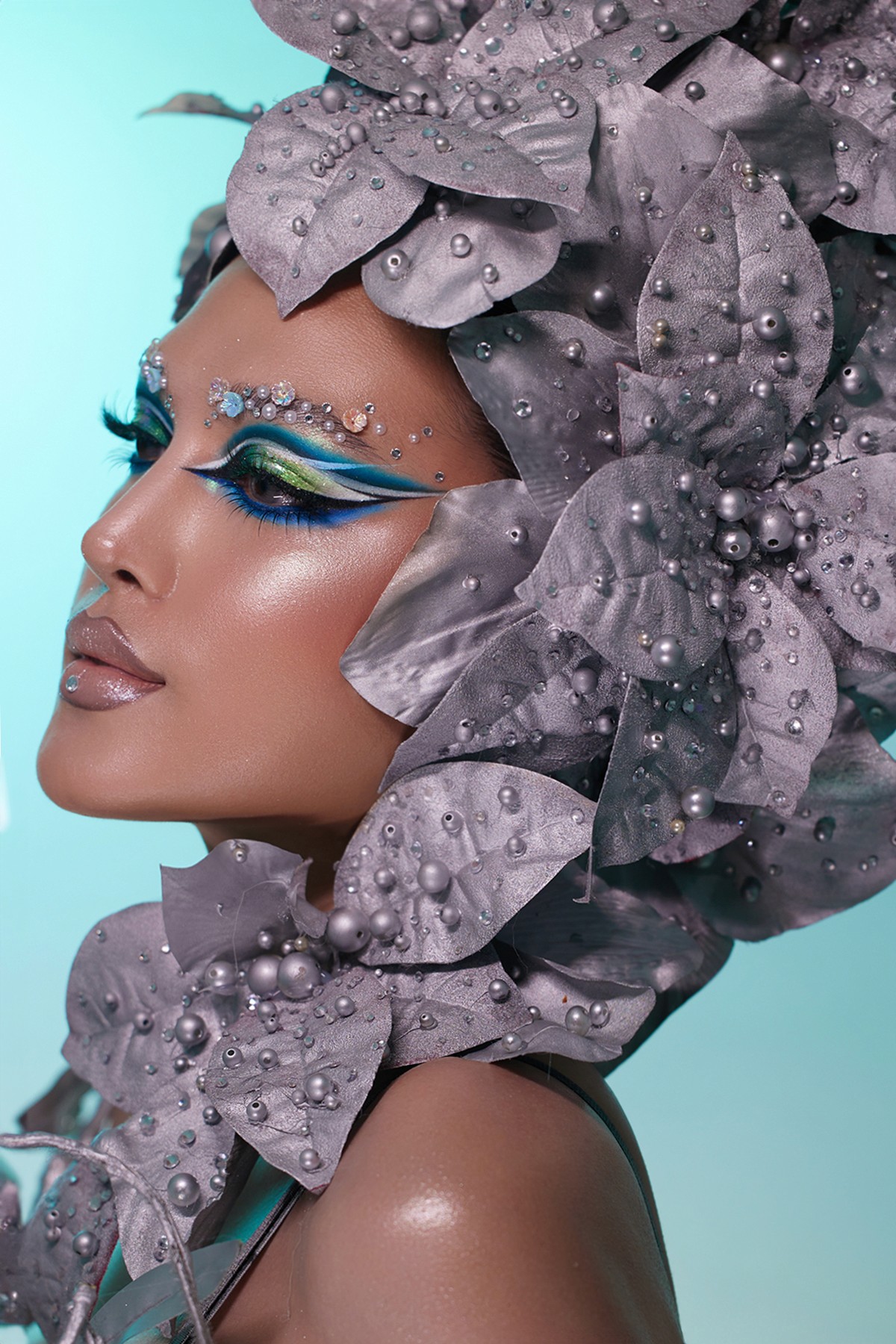 This creative makeup project explores bold color, texture, and artistic expression. Inspired by fantasy elements and high-fashion editorial aesthetics, the look combines vibrant eye designs, crystal embellishments, and sculptural styling to transform beauty into visual art.